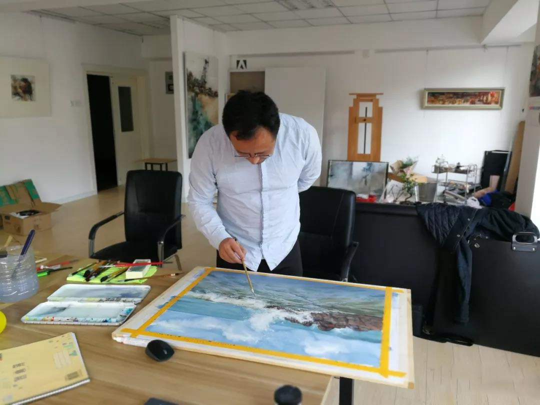 三年前,在我组织的崂山秋季水彩写生活动中,发现了他的身影。他的水彩画虽然技法生涩,却藏不住他对水彩艺术敏锐的灵感,水彩画的潜质,超乎我的想象。经过交谈,看出他毕业后工作的勤奋与敬业。在青岛工行从“门外汉”到支行部门负责人,二十多年拼搏,赢得了领导和客户的赞赏。工作之余,初心不改。作为业余爱好,常年坚持对绘画艺术的追求,展现了当代工行人的时代风采。渐渐得到了金融美协专家的认可,先后被推荐为:中国金融美术家协会会员、青岛金融美术家协会理事、青岛科技大学艺术学院校友会会长。2015年国画作品成功入选第九届山东美术新人新作展,在山东美术界崭露头角。